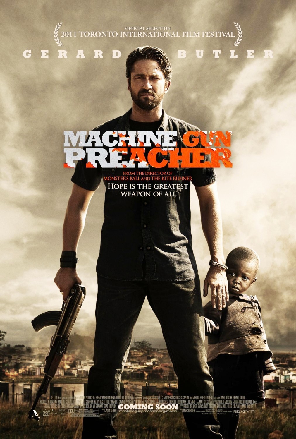 If you like Gerard Butler, and I do despite the horrible career choices induced by “Gamer”, “Law Abiding Citizen” and the God awful “The Bounty Hunter”, “Machine Gun Preacher” is not the antidote to his recent bad choices. It’s a forgettable drama that traps Butler in the role of Sam Childers, a reckless ex-con and drug addict who, upon his release from prison, continues his destructive behavior, until he hits rock bottom, finds Jesus and decides to travel to Africa and build a mission church. Once there, Childers is exposed to the horrors of the civil war, especially the killings and abductions of young children. At first glance, “Machine Gun Preacher” might sound like one of those graphic novel adaptations, especially with Butler in the lead, kicking ass. But that’s not really what the movie is about. At heart, the subject couldn’t be more serious. But with Butler in the lead, I just couldn’t buy it. This is not to say that the movie doesn’t have some good attributes, because it does. The story covers a lot of grounds, and has many powerful moments. Butler gives it his best, but there isn’t much nuance in his character. He loves his family and wants to be there for his daughter; yet he travels halfway across the world and abandons her. I was appalled, in particular, at the awkwardness of Mark Forster’s direction, repeatedly showing kids being murdered. I can understand the message behind these horrific scenes, but at some point, I felt a strong disconnection. Instead of being pulled in, my mind started to wander.That’s never a good sign. I hope Butler, Michael Shannon (who has a forgettable role here as Butler’s buddy), and Forster turn their attention to projects that are worthy of their time and talent. “Machine Gun Preacher” left me with nothing except regret that I’d invested the time to watch it.